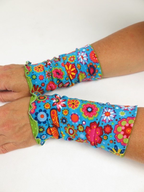 Diese Pulswärmer können von beiden Seiten getragen werden. Besonders schön sehen sie gerafft aus, so dass sich die einzelnen Farben mischen.