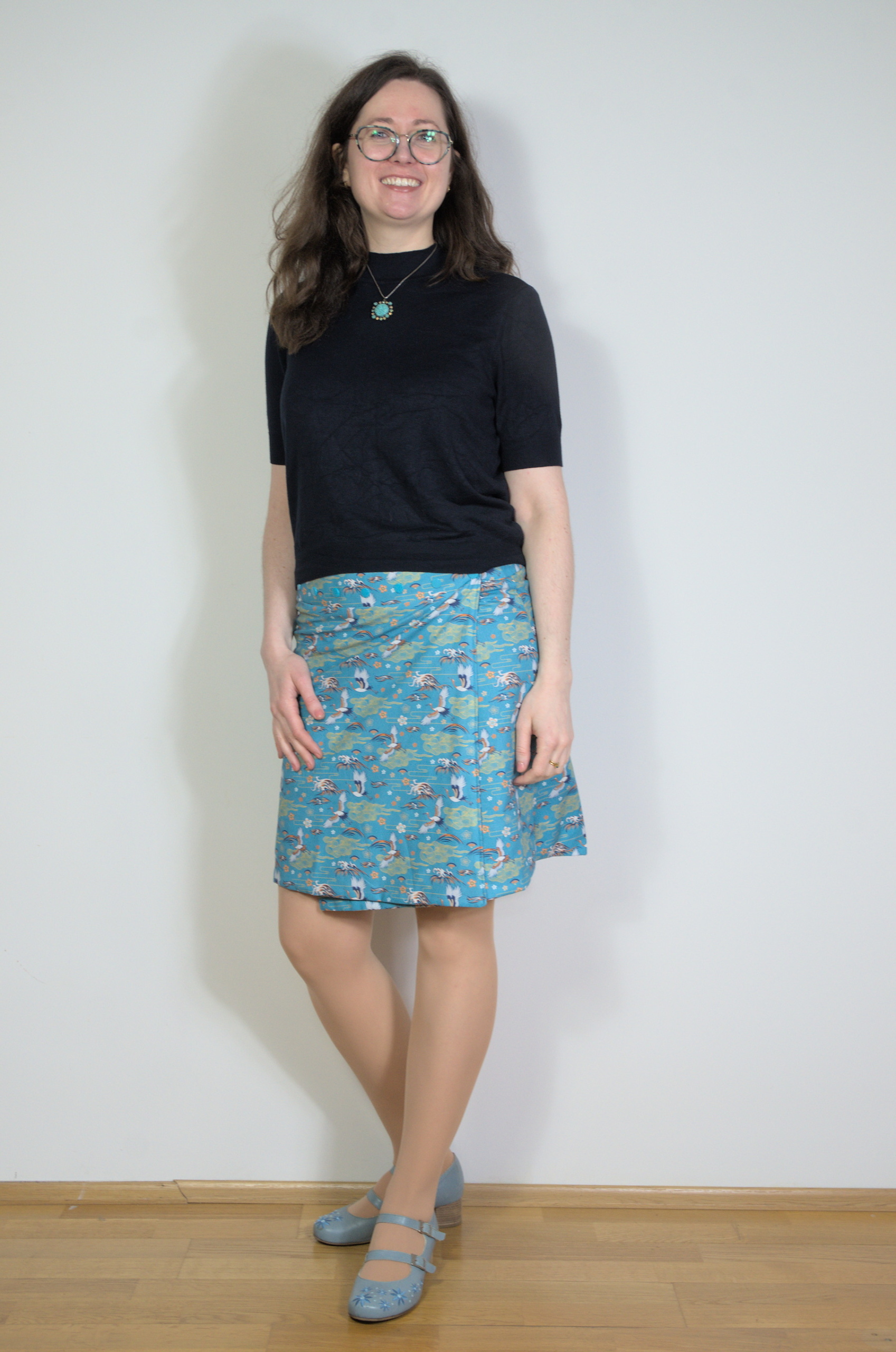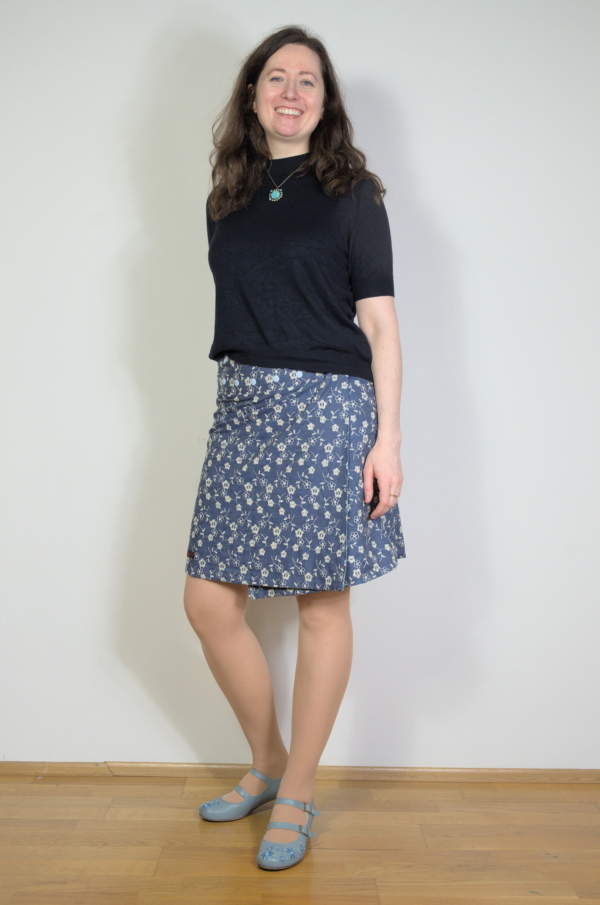Der Rock hat auf der einen Seite Baumwolle und auf der anderen Seite ein Seide- Baumwollgemisch. Er ist mit Bündchen 47 cm lang.
